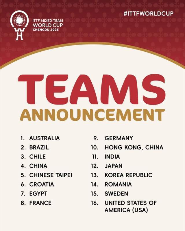 国际乒联正式确认了2025年成都混合团体世界杯16支参赛队伍,比赛将于11月30日至12月7日在中国成都举行
